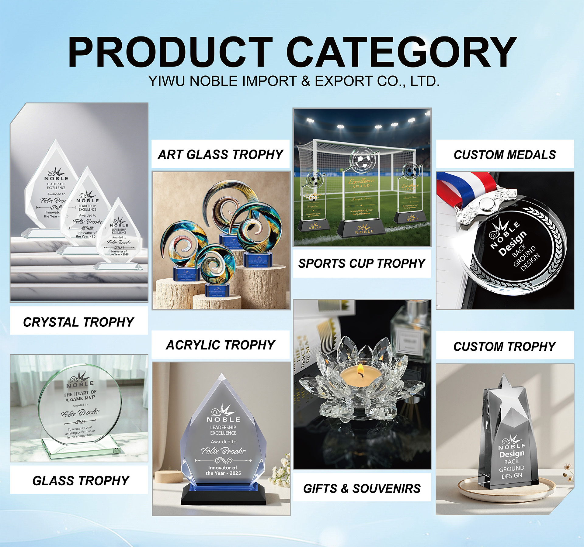 Yiwu Noble Imp&Exp Co., Ltd. Productos principales:Trofeo de cristal, 3D cubo de cristal, copa de trofeo de metal, Trofeo y Medalla personalizados, trofeo de cristal artístico, trofeo de acrílico